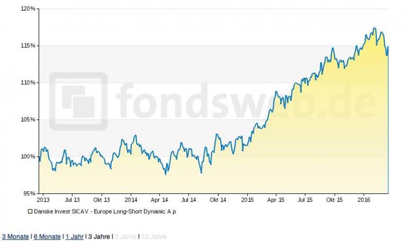 Ein Fonds, der in dieser Kategorie besonders glänzt, ist der Danske Europe Long / Short Dynamic. Hier die Ergebnisse per 17. März 2016:
